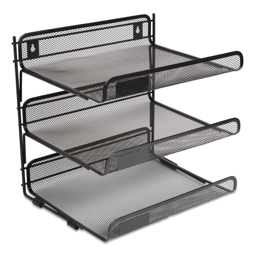 Customize your organization system to meet your needs. This versatile storage solution accommodates notebooks, paper pads, files, forms, documents and office supplies. A sleek design aesthetic featuring a tightly woven metal-mesh body with reinforced ribbing and a flat-square frame with rounded edges delivers reliable performance with a contemporary, professional flair. Side-Load Open DesignVersatile placement options: mount to a wall or place directly on a worksurface. Number of Compartments: 3; For File Size: Letter; Load Orientation: Side; Color(s): Matte Black.