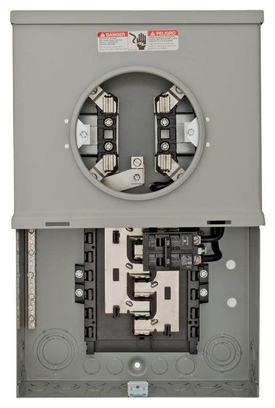 Combination meter socket. Surface mount, overhead service entrance only. 100 A maximum, 100 A main breaker installed. Single phase, 3-wire. 10 spaces, 20 circuits, 22,000 AIC rating. NEMA type 3R outdoor enclosure. Uses RX style hub, not included.