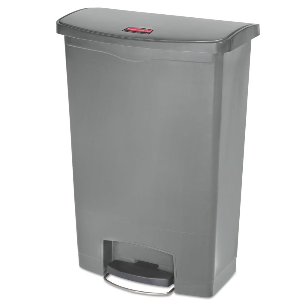 Designed to satisfy the diverse needs of any facility. Maximizes space efficiency with a small footprint and slim profile. Fits in even the tightest spaces. Internal hinge design prevents wall damage. Quiet and controlled lid-closure minimizes noise. Liner retainer band and cinch easily and securely holds can liners. Increased foot pedal clearance for easier access and operation. Front Step StyleFoot pedal located on the wide side of the container. Waste Receptacle Type: Indoor All-Purpose Waste Bin; Material(s): Polyethylene; Application: Indoor All-Purpose Waste Disposal; Capacity (Volume): 24 gal.
