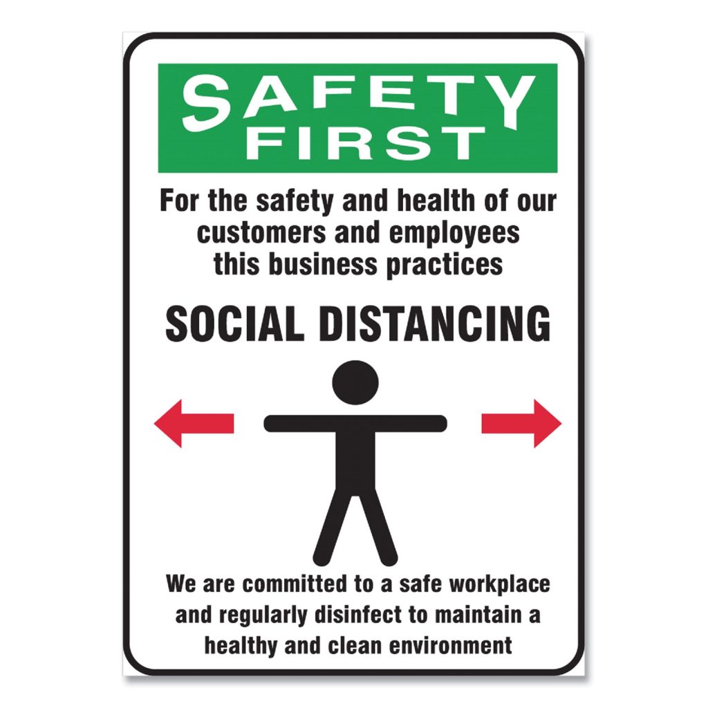 Alert and remind visitors, customers, and employees to practice social and physical distancing to prevent the spread of COVID-19, the Coronavirus. Durable plastic has slight flex that is ideal for indoor and sheltered outdoor environments. Printed surface has clear UV protective overcoat. Recycled content with UV inhibitors and good impact resistance. Rounded corners with 3/16″ mounting holes for installation. Size: 10 x 14; Message(s): Safety First for the Safety and Health of Our Customers and Employees this Business Practices Social Distancing We Are Committed to a Safe Workplace and Regularly Disinfect to Maintain a Healthy and Clean Environment; Material(s): Plastic; Orientation: Portrait.
