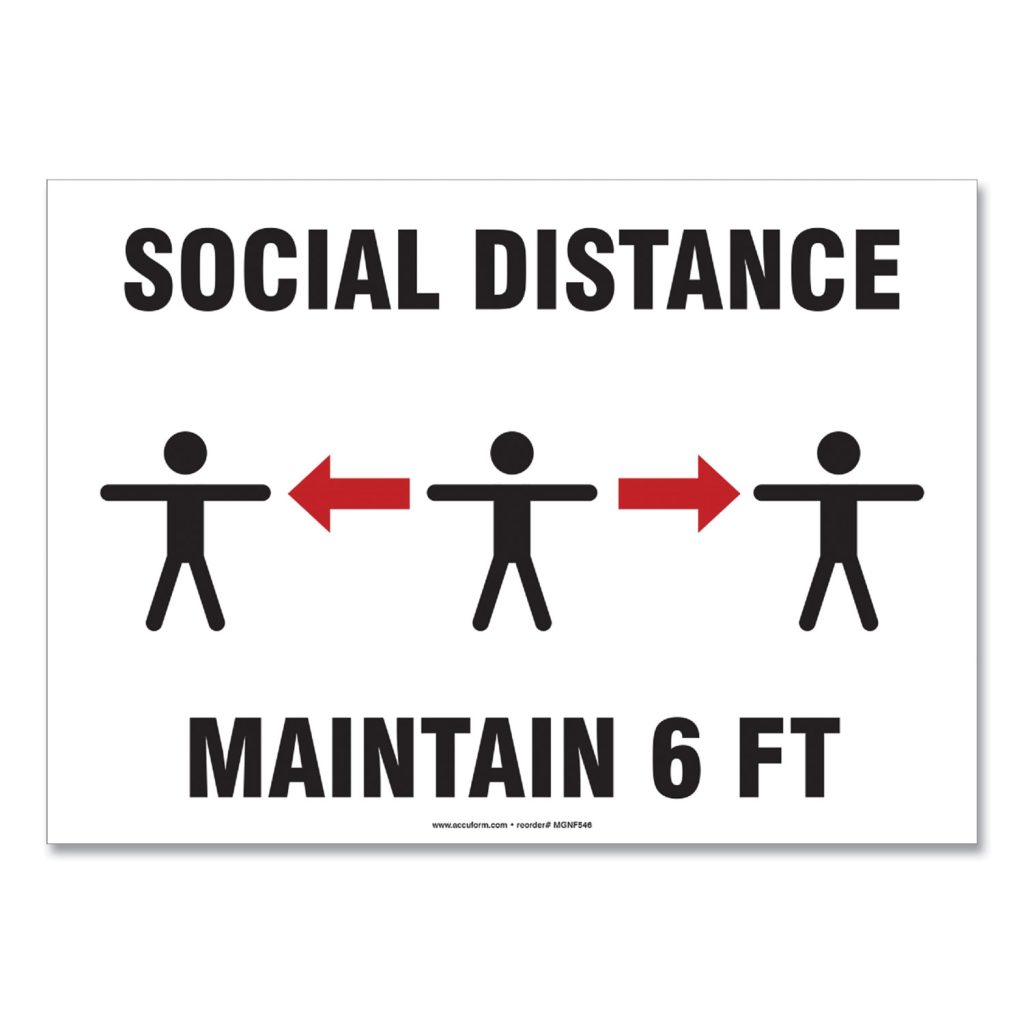 Alert and remind visitors, customers, and employees to practice social and physical distancing to prevent the spread of COVID-19, the Coronavirus. Durable plastic has slight flex that is ideal for indoor and sheltered outdoor environments. Printed surface has clear UV protective overcoat. Recycled content with UV inhibitors and good impact resistance. Rounded corners with 3/16″ mounting holes for installation. Size: 14 x 10; Message(s): Social Distance Maintain 6 Ft; Material(s): Plastic; Orientation: Landscape.