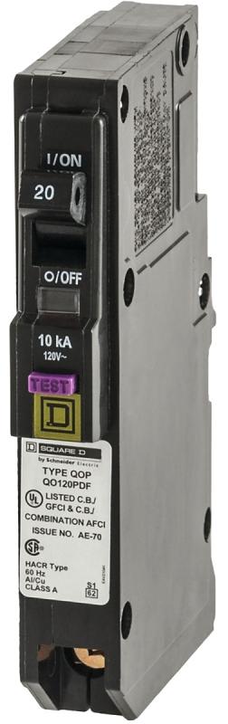 Square D QO120PDFC Circuit Breaker, CAFCI, Miniature, 20 A, 1-Pole, 120 V, Thermal Magnetic Trip