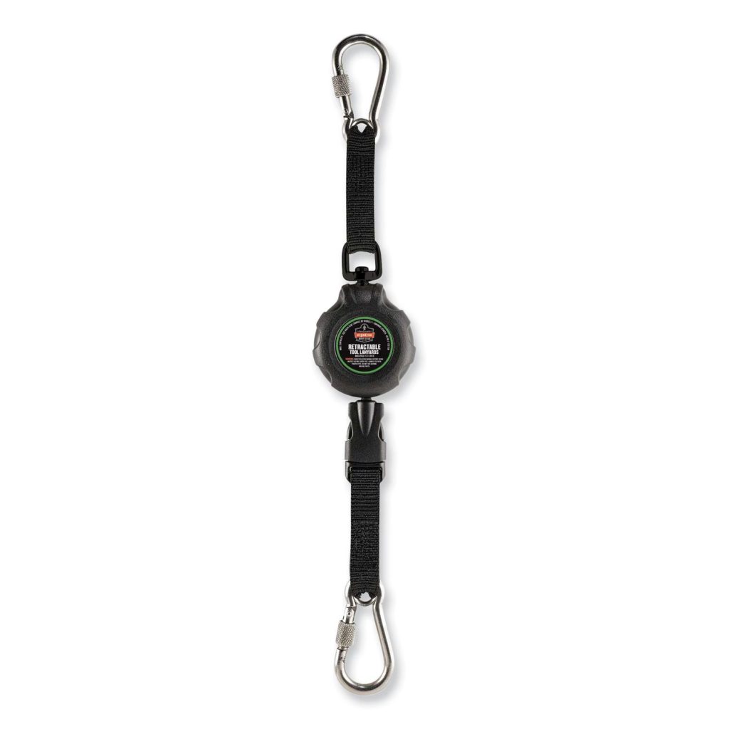 The patented Squids 3000 Retractable Tool Lanyard with Carabiner Tool Tether + Carabiner Anchor features a lightweight, low-profile retractable design that limits snags, tangles and tripping hazards. Use one manual-locking stainless steel carabiner for tethering hand tools weighing up to 1 lb, so that your tool is always kept close while you work at heights. Use the other carabiner for connecting the lanyard to your climbing harness’s D-rings or to some other anchor point. Swivel rings on both ends feature a full 360 rotational range to minimize ergonomics-related hassles. Fixed-length locks with self-setting pawls make it easy to set the desired lanyard length. Set your working length by pulling the ultra-strong Technora cord out to the desired length, and then slightly tug the cord upwards to lock it in place. To retract, slightly extend the Technora cord out a bit further to release the lock, allowing the cord to retract back into its industrial-grade, ABS housing. Modular connecting buckle makes it easy to quickly switch out your attached tool for any other that you have equipped with a Squids 3025 Stainless steel Carabiner Tool Tether (additional tethers sold separately). Safety lanyards are an integral part of any fall-protection plan and are used to reduce the risks associated with falling objects to ensure workplace safety. When working at-heights, its critical to tether your tools, so do it right with Squids tool lanyards and tethers. Third-party certified to a 2:1 safety factor. Fastener Style: Carabiner Anchor; Carabiner Tether; Lanyard Color(s): Black; Length: 48″; Safety Breakaway Connector: No.