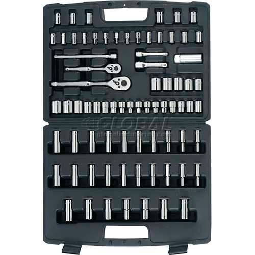 Made of chrome vanadium steel with SAE/mm markings. Meets or exceeds ANSI specifications. Includes 1/4 in and 3/8 in drive tools, (20) 1/4 in 6-point drive sockets, (20) 1/4 in 6-point deep drive sockets, (2) 1/4 in drive extension bars (3 in and 6 in), (1) 1/4 in drive pear head ratchet, (22) 3/8 in 6-point drive sockets, (7) 3/8 in 6-point deep drive sockets, (1) 3/8 in drive spark plug 6-point socket size 5/8 in, (1) 3/8 in drive 3 in extension bar and (1) 3/8 in drive pear head ratchet and carrying case.