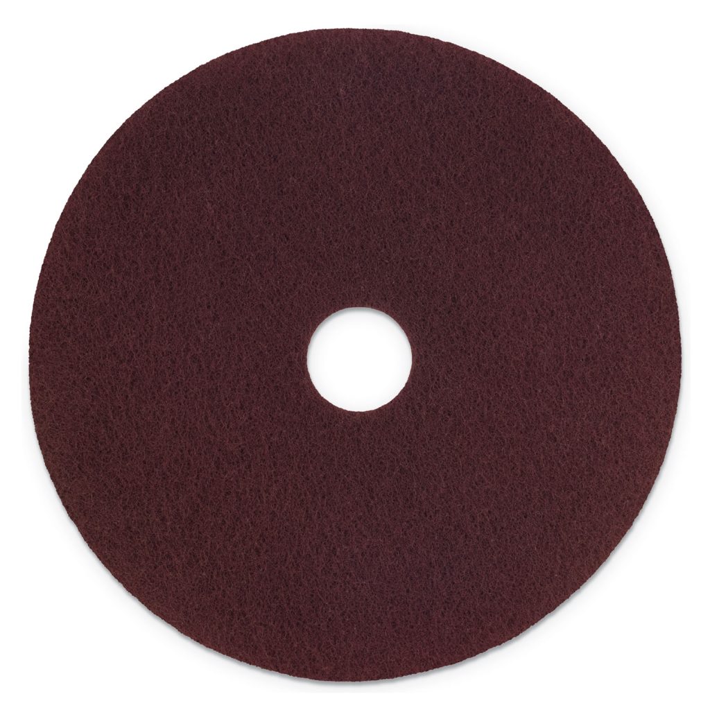 Aggressively scrubs finishes in preparation for recoating requiring only neutral cleaner or water. Does not require the use of a backer pad and clogs less than competitive scrub and recoat pads. Lasts longer than competitive pads and performs better throughout the life of the pad, helping to reduce labor hours and material costs related to stripping floors. Application: Prepping; Diameter: 17″; Color(s): Maroon; Color Family: Red.