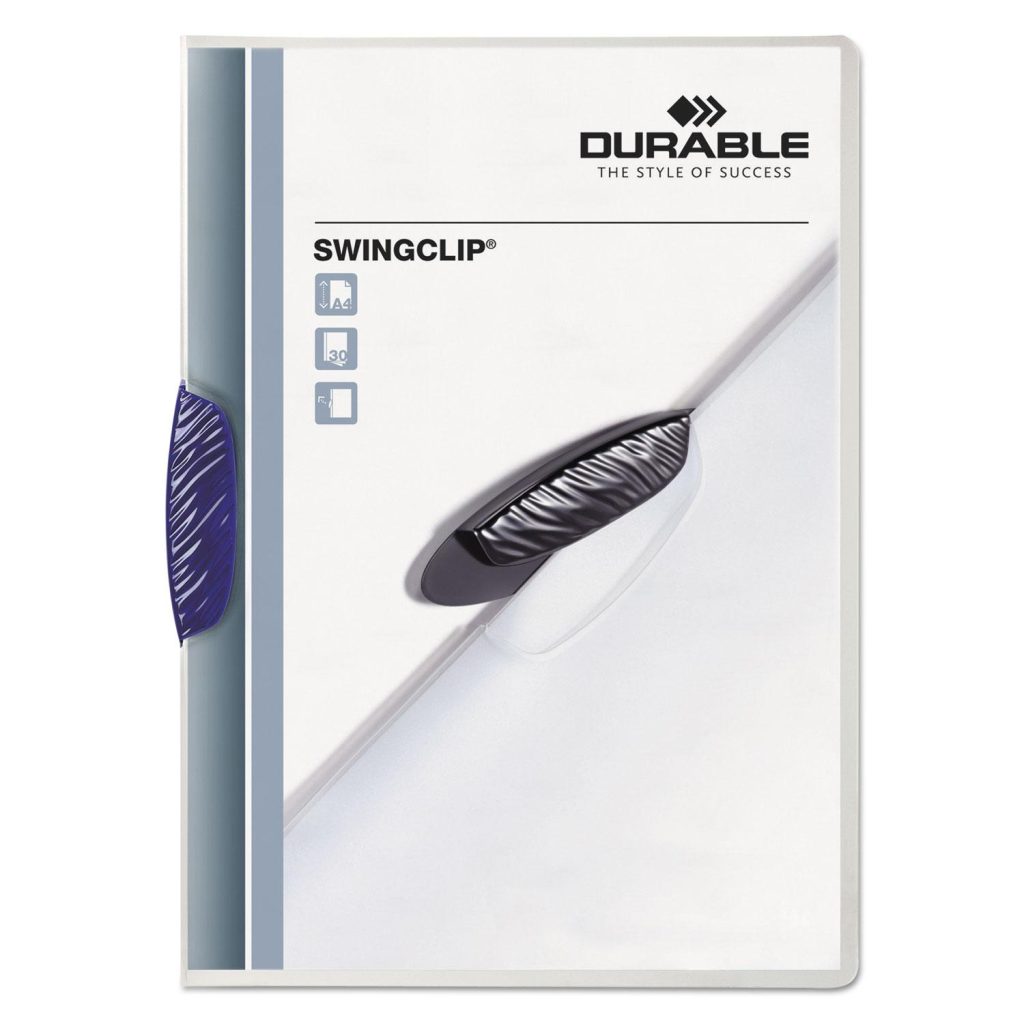 Elegant contoured clip binds documents and holds them in place. Documents can be exchanged or removed quickly and easily. No need to punch holes. Front cover opens flat for easy viewing. Extra-rugged polypropylene is transparent on both sides. Blue Clip. Front Cover Color(s): Clear; Color Family: Clear; Back Cover Color(s): Clear; Sheet Size: 8.5 x 11.
