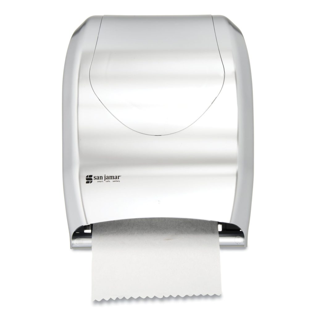 Hygienic touchless dispensing prevents germ spread. Just tear off towel and sensor activates to present another! Portion control provides 10 length every time. Dispenses any paper quality. Holds rolls up to 8 wide x 8 dia. and one 4 stub roll. Automatic transfer device allows complete usage of stub roll to eliminate waste. Lock prevents pilferage (waffle key incl.). Operates on four D alkaline batteries (sold separately); battery usage equivalent to dispensing 100, 800-ft. rolls. Impact-resistant plastic. Towels Dispensers Type: Roll Towel Dispenser; Capacity (text): One Roll; Material(s): Plastic; Color(s): Silver.