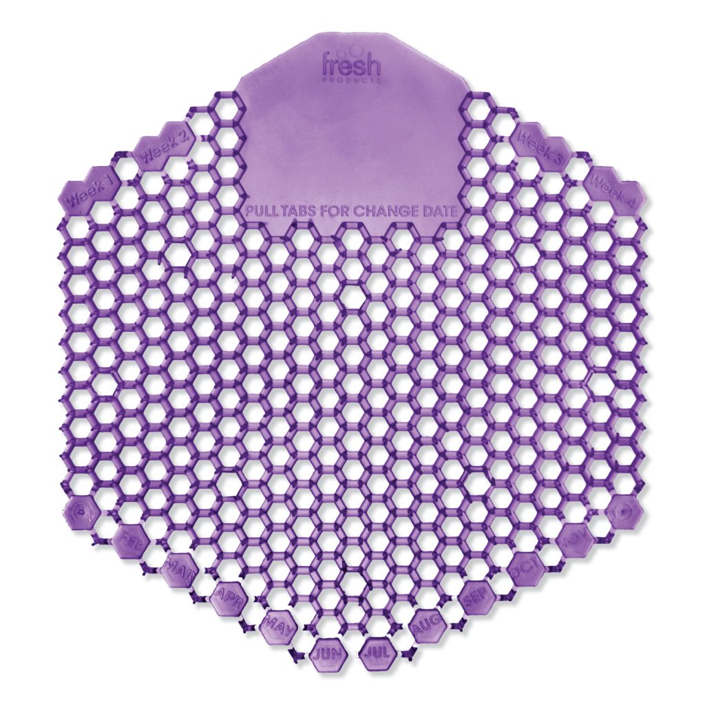 More freshness with ten times more fragrance for 30 days. Eliminates odors, reduces splash back and gradually releases fragrance, reducing cleaning time. Flexible, translucent vinyl screen allows full view of urinal drain to ensure optimal flow while trapping debris. Deodorizer Type: Urinal Screens; Scent: Fabulous; Capacity (Weight): 58 g; Color(s): Purple.