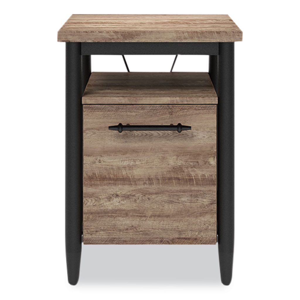 The Thomasville Breslyn file cabinet features a premium laminate surface. The metal legs are coated with a black nickel powder finish, and the cabinet offers an open storage shelf as well as a letter/legal file drawer for work essentials. This drawer file also pairs perfectly with the Thomasville Breslyn L-shaped desk (sold separately). Drawer Quantity: 1; Drawer Configuration: File; Color: Crosscut Hickory; Color Family: Brown.