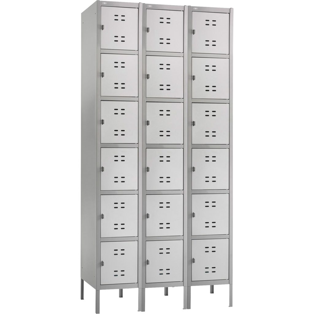 Heavy gauge, all-steel construction and strong uni-body design stand up to tough conditions. Raised 6″ off the floor for easier access and perforated for ventilation. Padlock clasp for security. Fully assembled units can be linked together for greater capacity. Three Lockers. Color: Two-Tone Gray; Overall Width: 36″; Overall Depth: 18″; Overall Height: 78″.