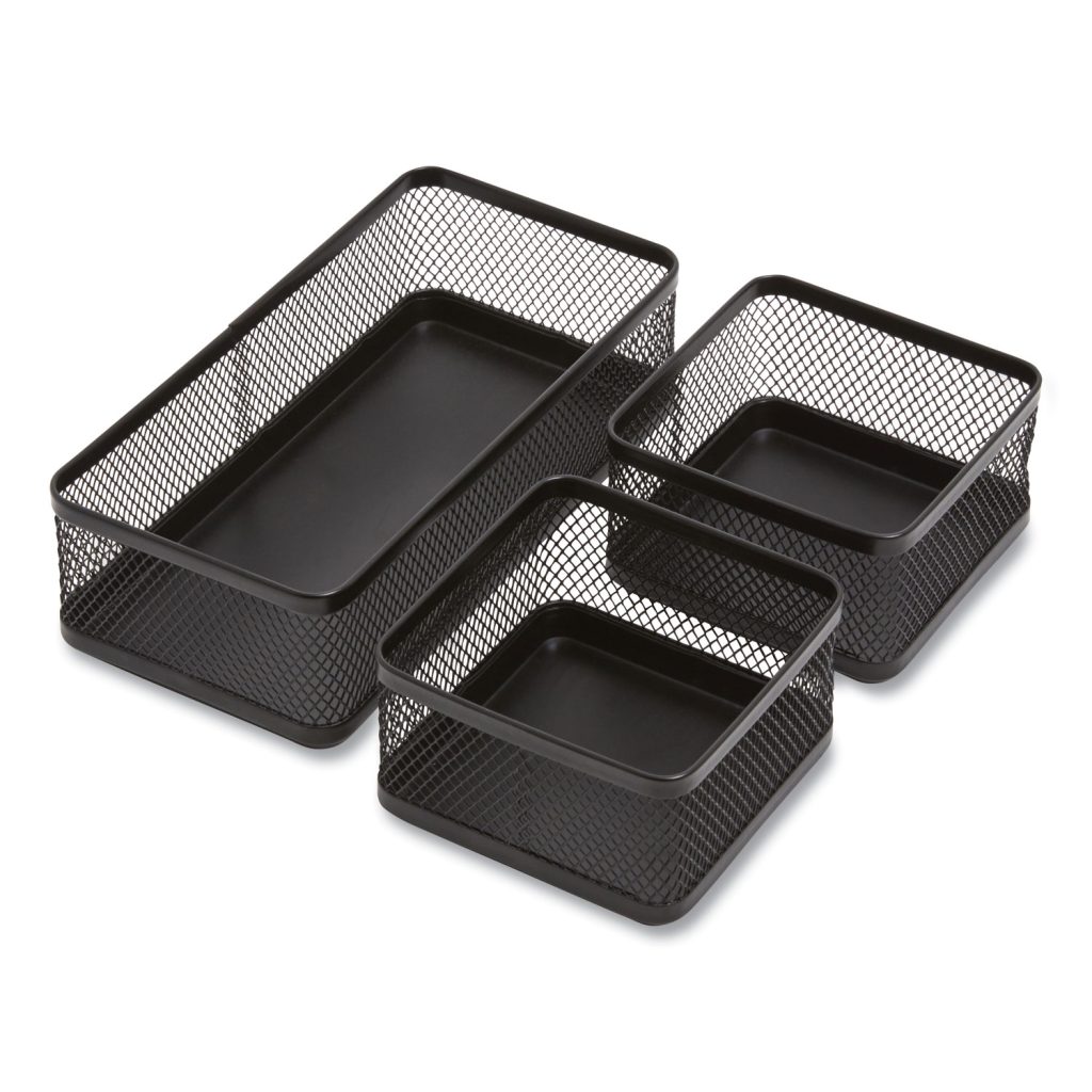 Secure small office supplies. Three stackable cups let you keep similar items together for easy location. Each cup can be placed to make the most of your desk space. Flat square-rounded edges bring a sleek look to your office, whether you use each cup alone or stack them together. Desktop Supplies Organizer Type: Multipurpose; Number of Compartments: 3; Overall Width: 8.46″; Overall Depth: 4.92″.