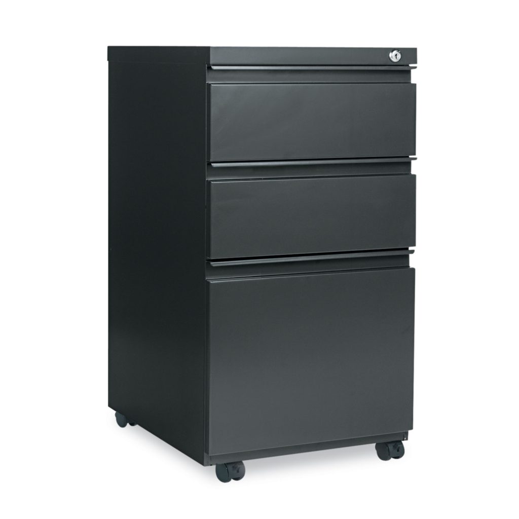 High-sided file drawer accommodates letter/legal filing. Counterweight prevents tipping. 4 casters, two locking. Full-length pull permits easy opening. Box/Box/File, Two 6″ high box drawers and one 12″ high file drawer. Color: Charcoal; Color Family: Gray; Overall Width: 14.96″; Overall Depth: 19.29″.