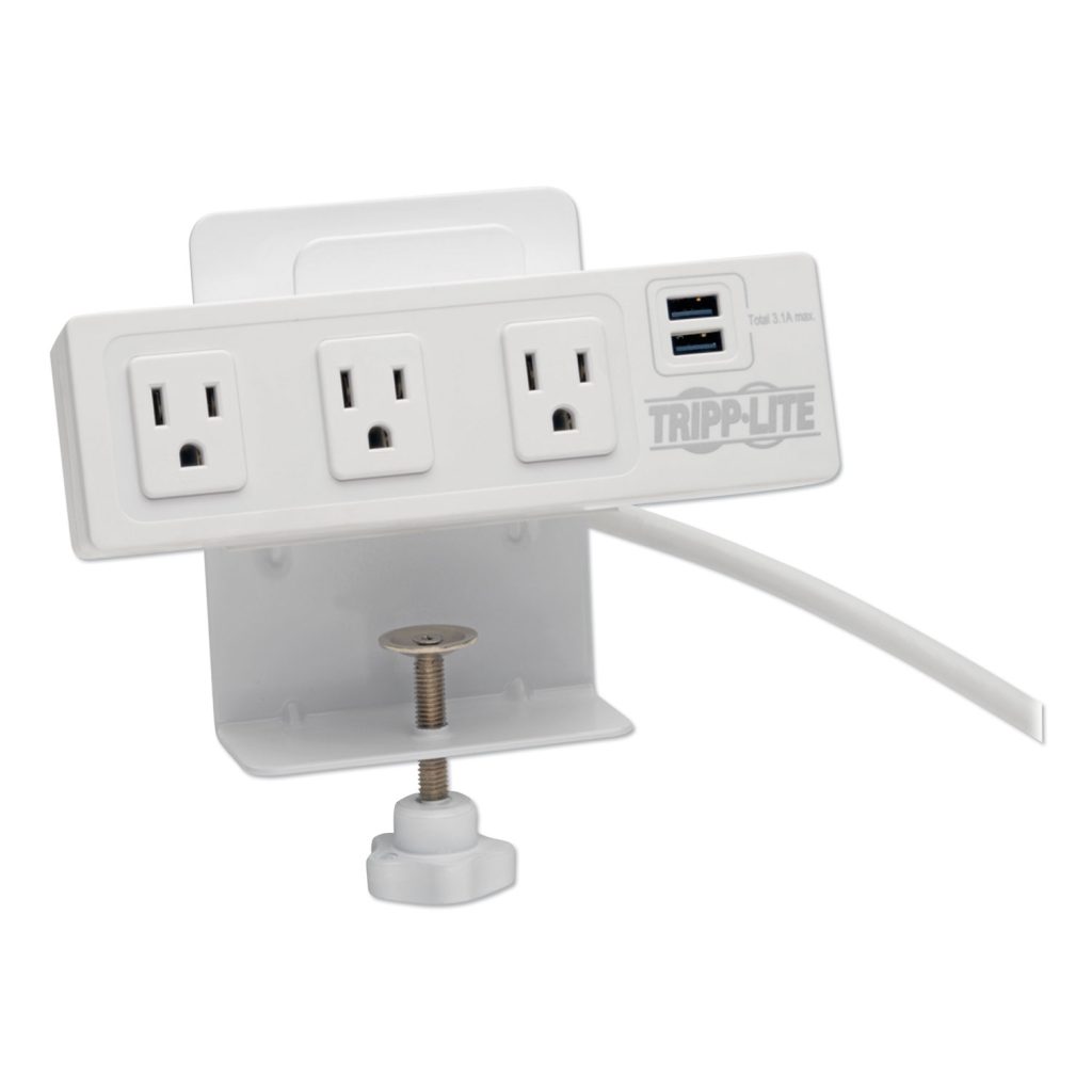 The 510-joule rating means your computer, printer, scanner, external hard drive and other sensitive electronic components are protected against strong surges and spikes. This power surge protector with USB ports features full normal mode (H-N) and common mode (N-G/H-G) line surge suppression. It filters out disruptive EMI/RFI line noise that can cause equipment damage or data loss and exceeds IEEE 587 Category A and B surge suppression specifications. Features two USB ports that produce 3.1A of combined power to charge your mobile devices, including smartphones, tablets and MP3 players. A top storage shelf holds smartphones and other small devices while theyre charging. Three-plug surge protector mounts to a clamp that attaches to most desks, tables and flat surfaces, bringing power and device charging to your desktop. The ten-foot power cord has a NEMA 5-15P plug and fits through the back of the clamp to reduce cable clutter. Tripp Lite will repair or replace any connected equipment damaged by surges, including direct lightning strikes, up to $20,000 for life (valid in the U.S., Canada and Puerto Rico only.) Number of Outlets: 3; Joules Of Surge Protection: 510 J; Lines: 3; Jacks: USB.
