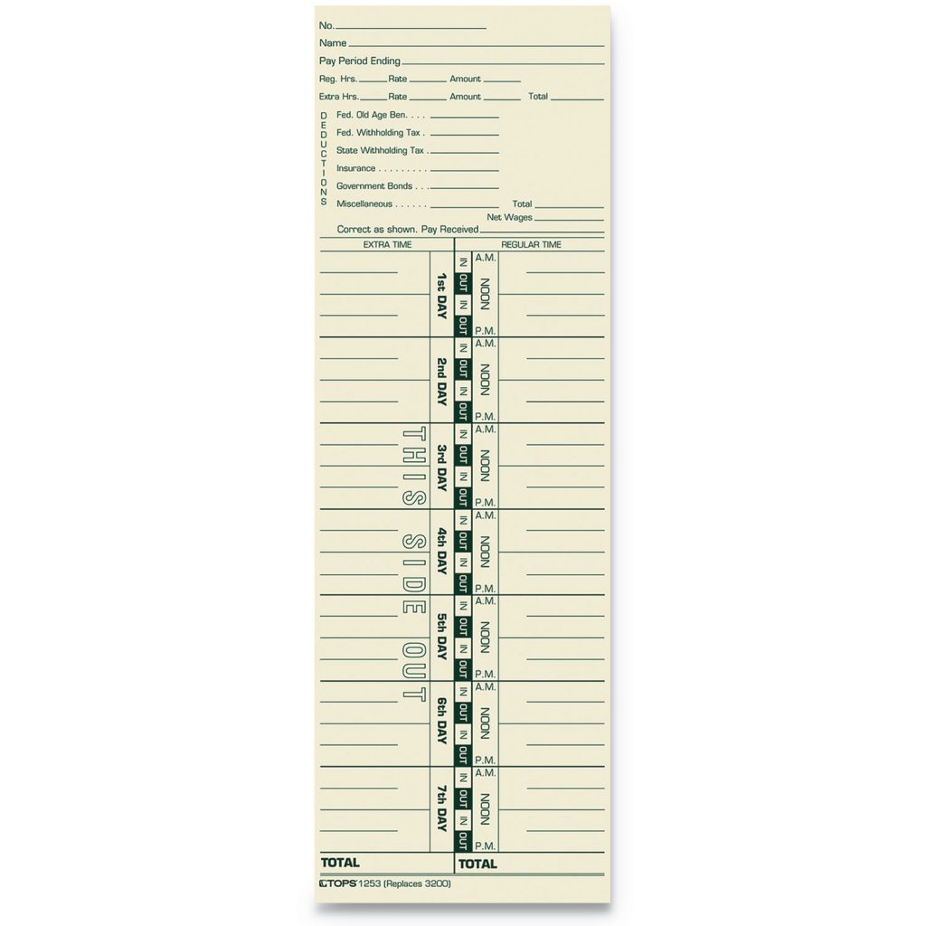 Equivalent to time clock manufacturer’s time cards. 143 lb tag stock. Manila Stock Printed Green on Front. Size: 3.5 x 10.5; Time Period: Weekly; Printing Sides: One Side; Card Quantity: 500.