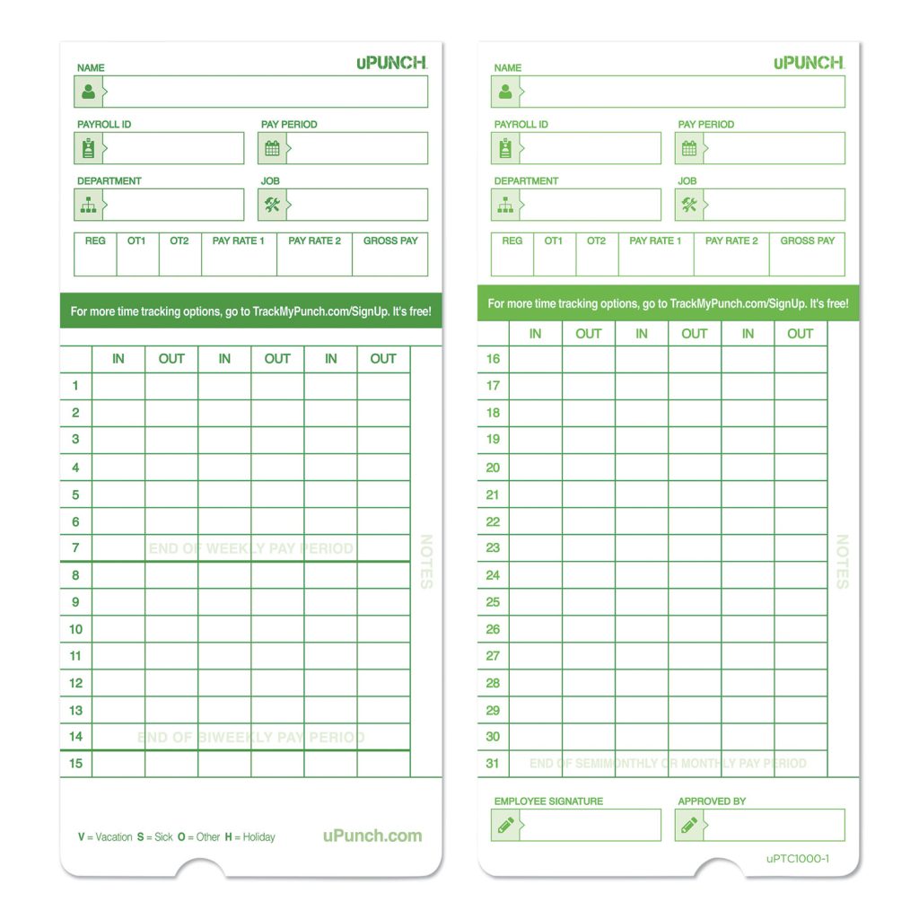Track your employees time clock punches on these high quality uPUNCH time cards. Use up to six columns for start time, break times, lunchtimes and finish time for all your employees. Size: 7.5 x 3.5; Time Period: Bi-Weekly; Monthly; Semi-Monthly; Weekly; Printing Sides: Two Sides; Card Quantity: 100.