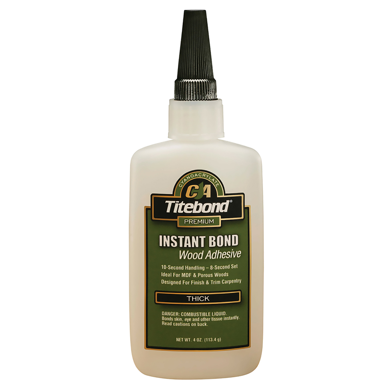 Titebond instant bond is a two-part bonding system that takes between 5 to 15 sec to set and 30 to 60 sec for initial cure. It provides a strong, permanent bond and is ideal for hard to reach joints or surface areas that are difficult to clamp. Designed primarily for wood and wood products, this adhesive is also very effective on a wide variety of materials and substrates. Titebond instant bond thick viscosity product offers an assembly time of 10 sec and an initial cure speed of 8 sec. It is ideal for bonding end-grain in a miter joint application, quick assembly of jigs and fixtures, adhering turning blocks to scrap blocks on a faceplate for immediate use.