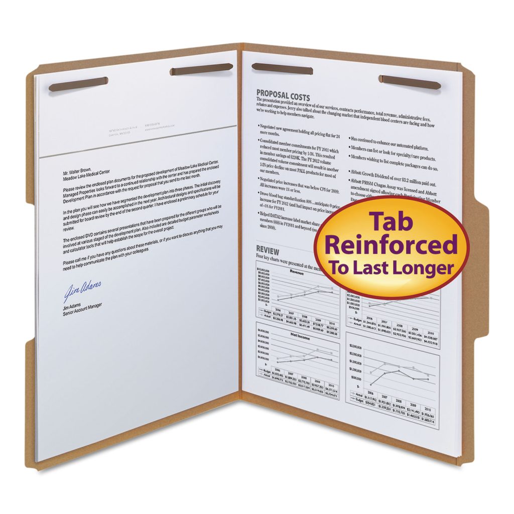 Hold papers securely and keep them in order with fasteners. Fasteners provide separate filing surfaces. Reinforced tabs for extra durability. 11 pt. KraftTwo fasteners. File Folder Size Type: Letter; File Folder Color: Kraft; Color Family: Brown; File Folder Material: 11-pt Kraft.