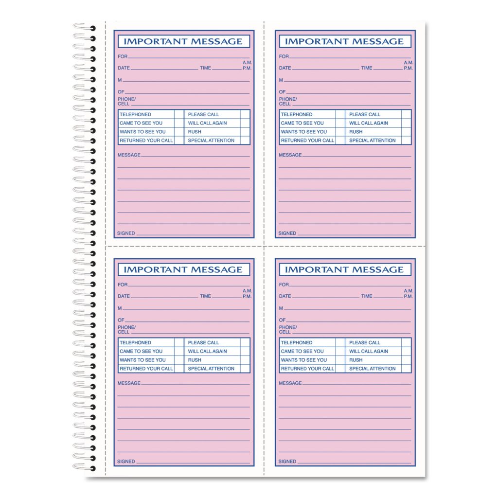 TOPS 4CPP Important Phone Message Book – 400 Sheet(s) – Spiral Bound – 2 PartCarbonless Copy – 8 1/4″ x 11″ Sheet Size – White – Assorted Sheet(s) – Blue, Red Print Color – 1 Each| Spiral-bound book provides a permanent record of every important message. Message forms are perforated and printed in blue and red ink. Each page has four carbonless message forms. Two-part forms include a pink original and canary duplicate. Message book has 400 sets and a notes section on the flipside for longer messages. Detached size is 5-1/2″ x 3-7/8″.Spiral-bound book provides a permanent record of every important message. Message forms are perforated and printed in blue and red ink. Each page has four carbonless message forms. Two-part forms include a pink original and canary duplicate. Message book has 400 sets and a notes section on the flipside for longer messages. Detached size is 5-1/2″ x 3-7/8″.