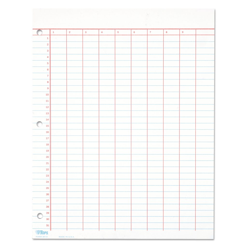 TOPS Summary Column Data Pads – 50 Sheet(s) – 11″ x 8 1/2″ Sheet Size – 3 x Holes – 9 Columns per Sheet – White – White Sheet(s) – 50 / Pad| Use column data pad in portrait format to use or tabulate data. High-quality, 20 lb. bond paper features precise rulings printed with nonsmear inks. Each heavyweight sheet features columns for organized data recording. Glue binding construction allows clean and easy sheet removal. The three-hole punched pad inserts easily into a binder or notebook. 27 point chipboard backer offers writing support. Pad contains 50 sheets.Use column data pad in portrait format to use or tabulate data. High-quality, 20 lb. bond paper features precise rulings printed with nonsmear inks. Each heavyweight sheet features columns for organized data recording. Glue binding construction allows clean and easy sheet removal. The three-hole punched pad inserts easily into a binder or notebook. 27 point chipboard backer offers writing support. Pad contains 50 sheets.