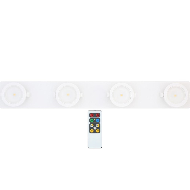 Base with four independently swiveling, pivoting light heads with super-bright white LEDs. Choose from three power settings: on, dim, or off with a push button or IR remote. The remote works from a range of up to 20 feet. Installation with the included hook and loop tape or mounting bracket. Runs on 6 AAA batteries (not included).