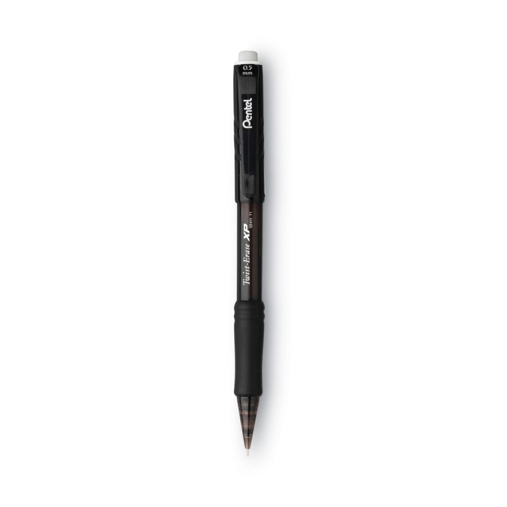 The Pentel Twist-Erase Express features a comfortable, extra-soft latex-free grip for less writing fatigue. A larger-than-ordinary and long-lasting twist-up eraser cleanly erases any mistakes no smudges, no paper tears and no ghosts. It comes pre-loaded with Pentel Super Hi-Polymer HB lead; no sharpening required and produces a dark line. Retractable (Yes/No): Yes; Eraser (Yes/No): Yes; Graphite Color(s): Black; Color Family: Black.