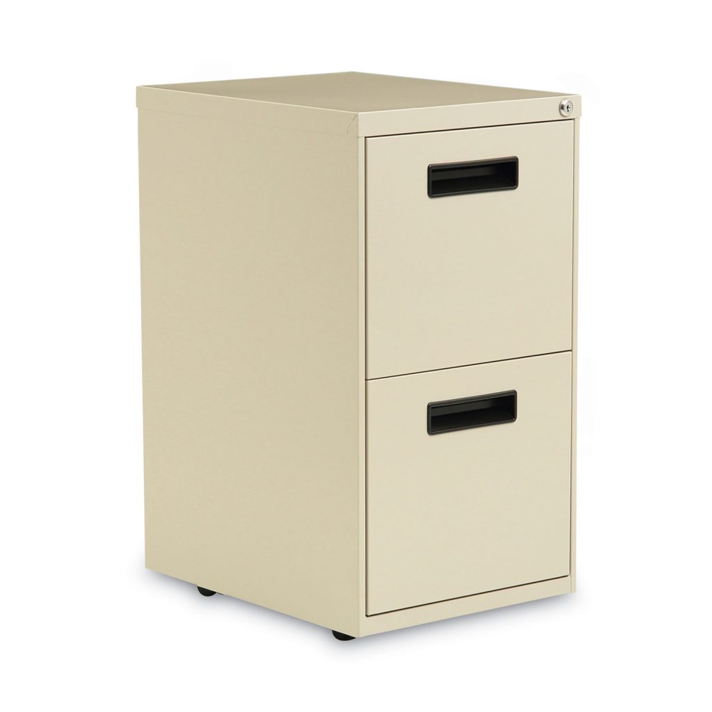 High-sided file drawer accommodates letter/legal filing. Counterweight prevents tipping. Visible easy-access casters, two locking. Steel ball bearing slide suspension with 3/4 extension on box drawers and full-length extension on file drawers. Full-length pull permits easy opening. Box drawers include one divider and pencil tray. File/File, Two 12″ high file drawers. Color: Putty; Color Family: Beige; Overall Width: 14.96″; Overall Depth: 19.29″.