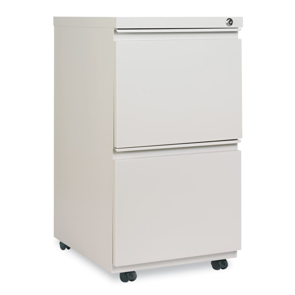 High-sided file drawer accommodates letter/legal filing. Counterweight prevents tipping. 4 casters, two locking. Full-length pull permits easy opening. File/File, Two 12″ high file drawers. Color: Light Gray; Color Family: Gray; Overall Width: 14.96″; Overall Depth: 19.29″.