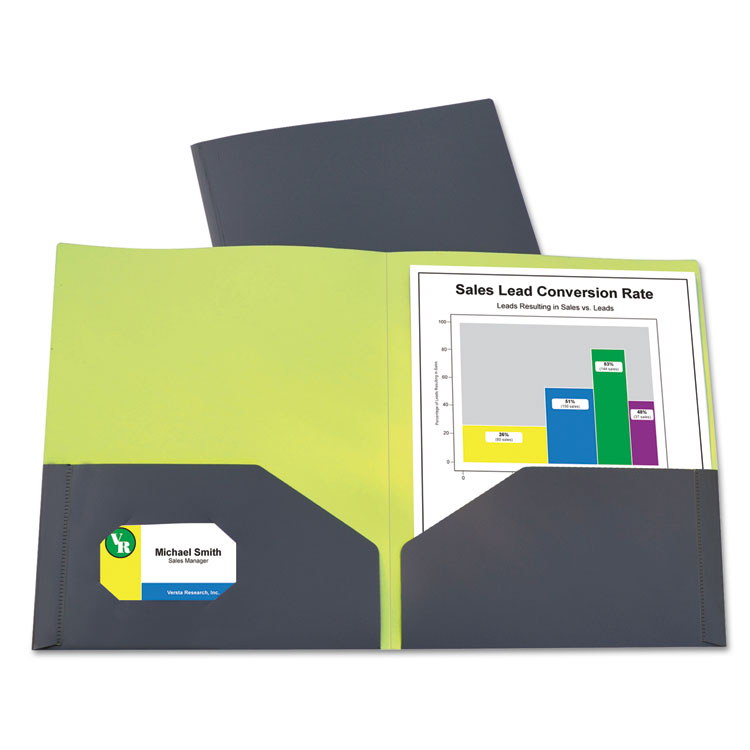 Sophisticated two-pocket folders hold presentations and proposals. Keep track of letter-size documents by organizing them in these durable portfolios. Stylish two-tone material features an eye-catching mirror finish exterior and subtle matte finish interior. Super heavyweight poly material resists tearing. Features business card slot on front inside pocket. For 8 1/2″ x 11″ materials. Front Cover Color(s): Charcoal Gray/Lime Green; Color Family: Gray; Back Cover Color(s): Charcoal Gray/Lime Green; Sheet Size: 8 1/2″ x 11″.