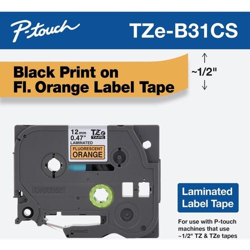 Brother label tape is compatible with P-Touch label printers and is perfect for labeling kitchen, shelving, and supply cabinets. The labels are easy to print and apply to a variety of surfaces. The split back of the P-Touch label tape can be removed with ease, which makes Brother TZe replacement label tape simple to peel and apply to tables and shelves made of steel, wood, plastic and more. This product is a Brother Genuine replacement product, which will help reduce the possibility of damage to the P-touch label maker. Using Brother Genuine supplies delivers quality results and protects your P-touch from damage. Label Size – text: 0.47 x 26.2 ft; Label Color(s): Orange; Machine Compatibility: Brother P-Touch Label Makers that use 1/2 TZ & TZe Tapes; Catalog Description: Brother Genuine P-Touch, TZe-B31CS, 0.47 x 16.4 ft, Black on Fluorescent Orange Laminated Label Tape.