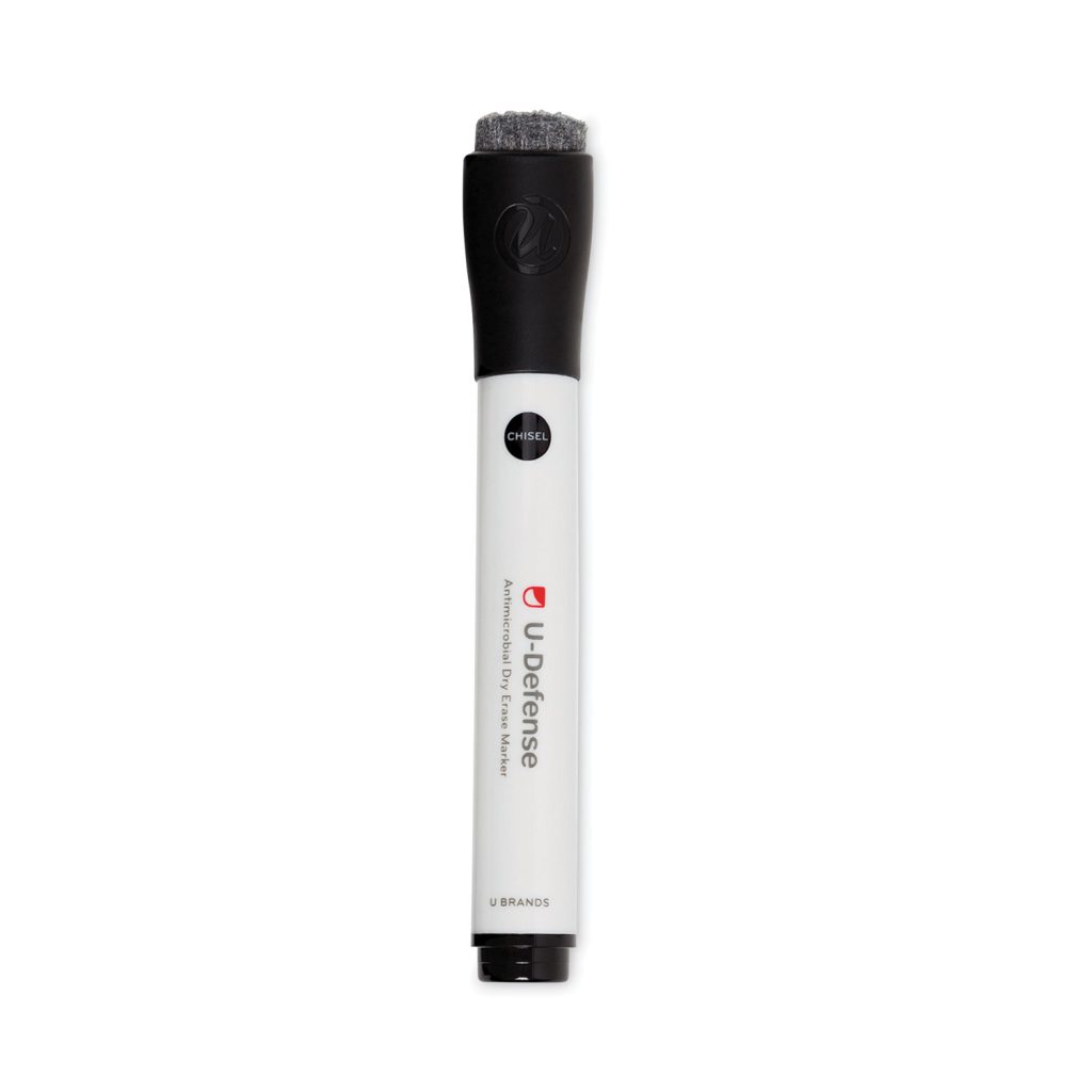 For a cleaner office, classroom, or home experience, U-Defense Antimicrobial Dry-Erase Markers By U Brands provide maximum protection. A silver-based antimicrobial agent is integrated into the marker barrel and cap during manufacturing, and works to prevent the growth of microorganisms like bacteria, mildew, and mold. Featuring everything you love about U Brands Dry-Erase markersbold ink laydown, contoured caps with built-in erasers. You can now feel better about sharing with classmates or coworkers. Marker Ink Type: Dry Erase; Marker Tip Type: Chisel; Marker Tip Size (text): Broad; Marker Color(s): Black.