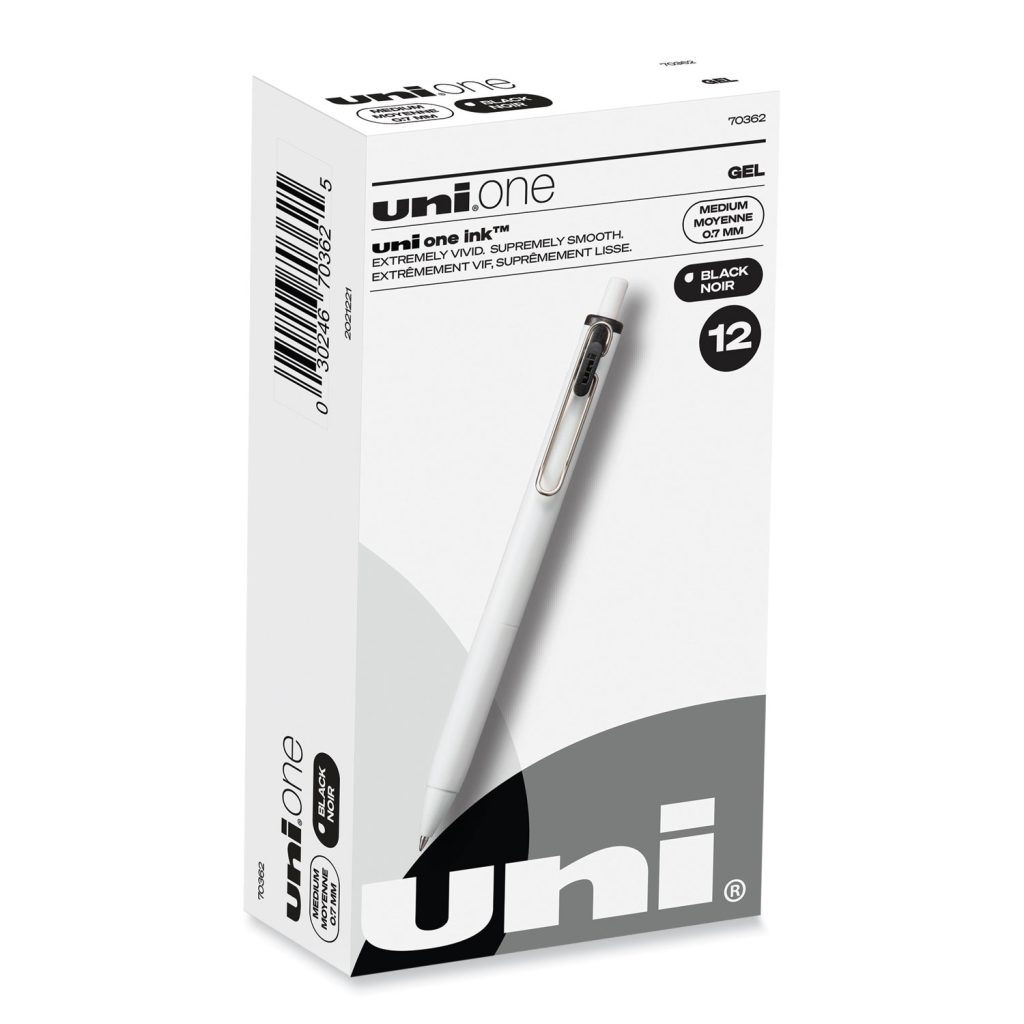 Experience the next stage of ink technology innovation with uniONE Retractable Gel Pens. The revolutionary gel ink is specially formulated with large pigments that do not absorb into the paper. This results in writing and drawing that is darker, brighter and ultra vivid. Quick drying gel pens resist smudging, smearing and bleeding, making them ideal for crisp and easy to read notes and assignments. A 0.7 mm medium tip strikes the perfect balance between bold and detailed lines. The sleek white barrel with integrated anti-slip grip makes this pen a stylish writing tool. Additionally, the functional wire clip indicates the gel ink color, as well as opens wide for easy attachment to papers, notebooks or folders. uni-ball uniONE gel ink delivers superior writing performance whether at school, at home or at work. Pen Sub-Brand & Product Family: uniONE; Pen Type: Gel Pen; Pen Style: Retractable; Pen Tip Type: Conical.