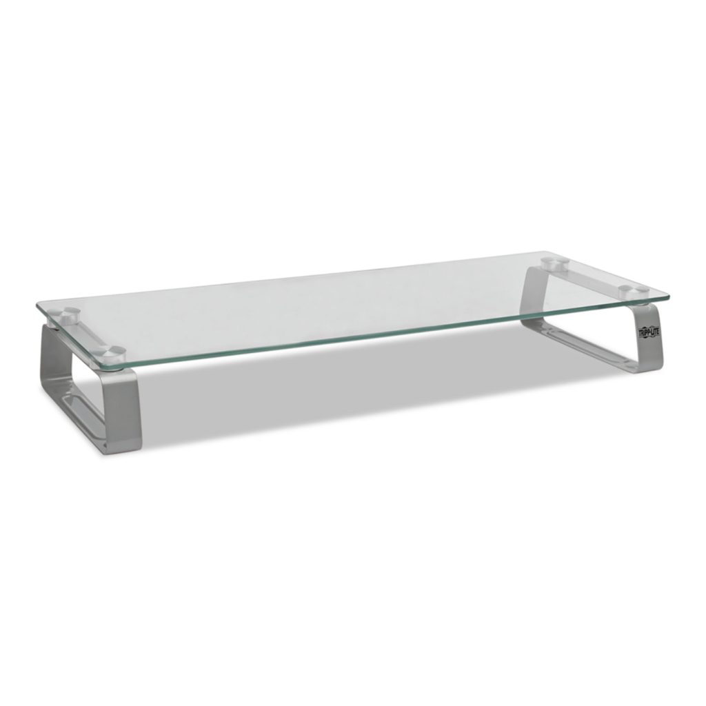Not only frees up valuable space on your desk, table or workstation, it does so with chic, contemporary style that fits perfectly into any home or office decor. Placing your monitor three inches above the surface also helps ease eye and neck strain. The extra-large tempered glass platform supports up to 40 pounds, making it ideal for laptops, printers, fax machines and small televisions. Brushed aluminum legs with rubber feet secure the riser on smooth surfaces. A keyboard can fit easily beneath the glass platform for convenient storage. Assembles in seconds using the included hardware. OEM/Compatible: Compatible; Workstation Type: Mobile Workstation; Traditional Desk/Table; Width (Max): 22″; Depth (Max): 8″.