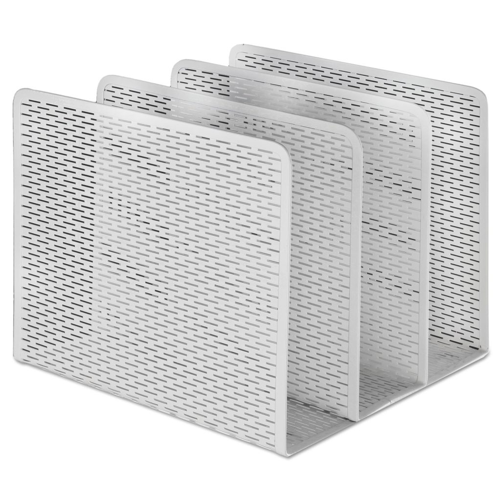 Strong, professional grade punched metal with decorative urban style slotted pattern. High quality satin finish complements any dcor. Features protective feet to prevent wear and scratches on the desktop surface. Reinforced rounded edges provide durability and attractive detailing. Three compartments can hold and organize large catalogs, file folders, writing pads, and even binders up to 3 deep. Number of Compartments: 3; For File Size: Letter; Load Orientation: Front; Color(s): White.
