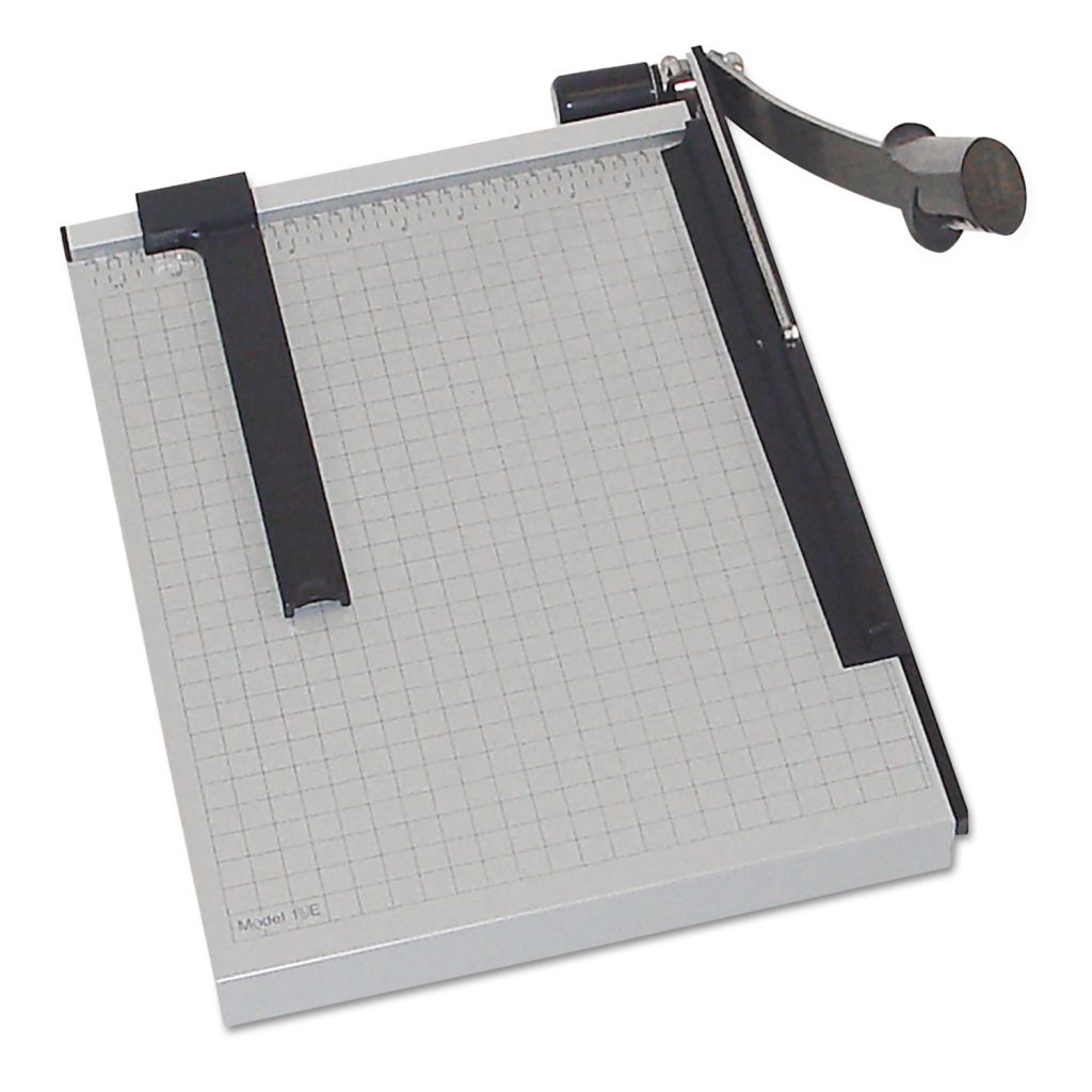 “De­signed to hold up to rigorous activity, day in and day out. The machine-ground, lever-style blade is sharp and accurate enough that it can re­move even the tiniest sliver of paper from your work. For safety, a spring-action handle prevents the blade from falling down unexpectedly. Lightweight and marked with guides, Vantage® trimmers offer safety and convenience, while giving you the accuracy you require. To ensure an even cut, each trimmer features an automatic clamp that provides firm, even pressure, pre­venting paper from shifting. To protect the blade and keep fingers safe, the handle can be locked in the down position. For durability, the sturdy metal base provides a solid foundation. For measuring, the base contains carefully screened guides and an adjustable backstop — which is the easiest way to ensure accuracy during repetitive cuts. And for portability, it’s designed to be light enough to take anywhere. Trimmer Board Type: Guillotine; Sheet Capacity: 15; Cut Length: 18″”; Blade Material: Metal.”
