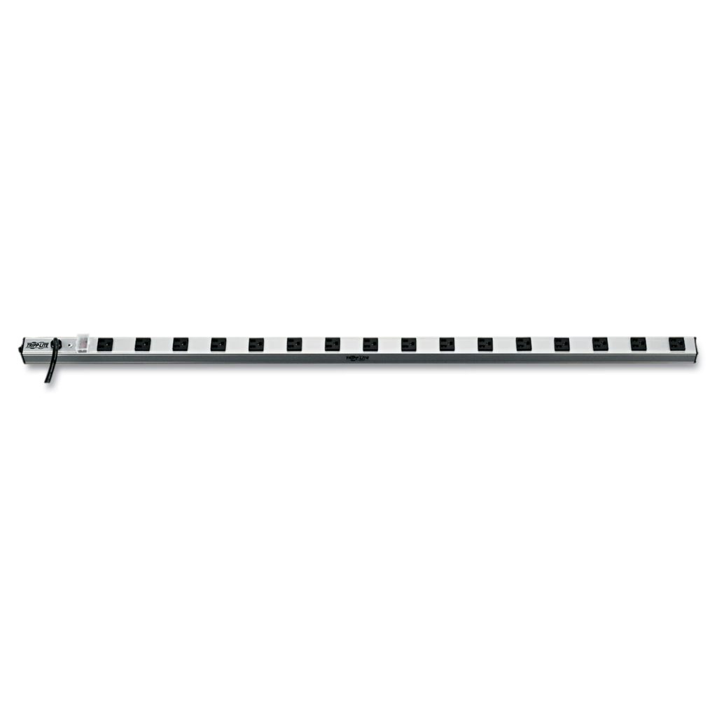 Provides multi-outlet AC power distribution. ideal solution for applications or locations that require power to many devices simultaneously. It allows for both vertical and horizontal mounting, making it ideal for a variety of uses including office, rackmount, workbench, industrial and telecom applications. With the extra-long power cord, you don’t have to install the power strip next to outlets you already have; it can be mounted across the room and deliver reliable service where you need it most. A lighted and covered On/Off switch helps prevent accidental shut-offs, while the circuit breaker guards against dangerous circuit overloads. Its sturdy all-metal extruded aluminum housing stands up to demanding network, laboratory or factory environments. Power Capacity: 1800W; Cord Length: 15 ft; Number of Outlets: 16; Current: 15 A.