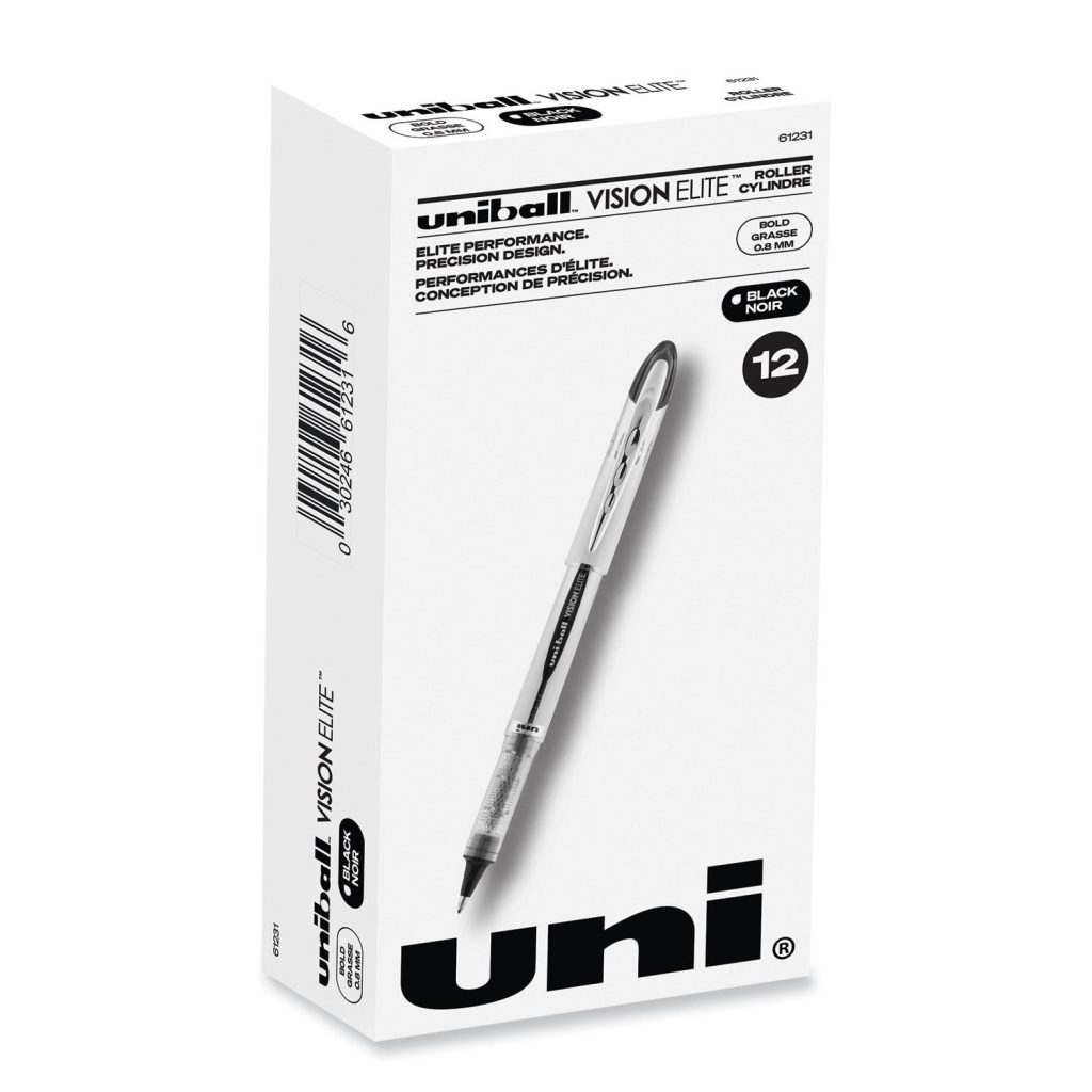 Create ideas as vividly as can be imagined with Vision Elite Rollerball Pens from uni-ball featuring a bend-resistant stainless steel tip and a tungsten carbide rollerball. Capped roller pens deliver smooth, intense lines with unparalleled definition – useful for note taking, list making, signing checks and legal documents, and even uniquely embellishing creative writing projects. Innovative uni Super Ink technology effectively entraps the gel ink into the paper, producing fraud, fade and water-resistant documents that resist check washing or bleaching. These Vision Elite pens have a special design that withstands cabin pressure variances without leaking, making them useful for travelers. Exclusive Uni-Flow Ink System ensures a consistent, delightfully fluid writing experience, and a translucent window ensures that you don’t run out of ink unexpectedly. Express your signature style with the sleek, modern design and elite performance of uni-ball’s Vision Elite Rollerball pen – no matter the altitude.