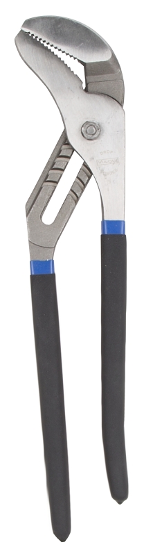 Groove joint pliers are made from steel and feature straight jaw and non-slip, vinyl handle, 16 in OAL.