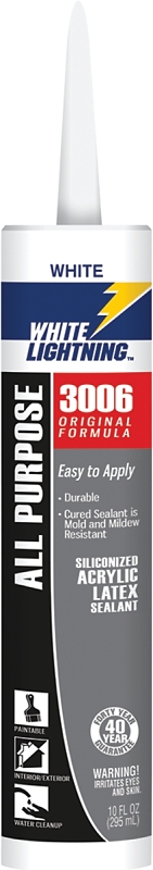 White Lightning 3006 Advanced formula provides a smooth application that can be painted in 30 mins. It is ideal for filling joints and openings around doors, windows, baseboards, trim, siding and vents. For use on wood, drywall, metal, glass, masonry and most plastics.
