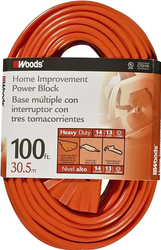 Woods 0827 Extension Cord, 14 AWG Cable, 100 ft L, 13 A, 125 V, Orange Jacket