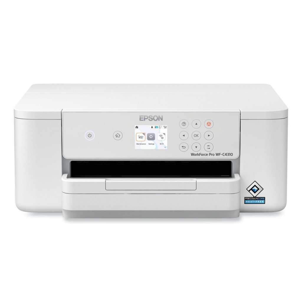Streamline your business’s workflow and increase efficiency with the WorkForce Pro WF-C4310 Color Printer. Designed for reliability and reduced downtime, this printer provides exceptional productivity, with an impressive recommended monthly page volume (MPV) up to 1,600 pages and print speeds of 21 black/11 color ISO ppm. And, thanks to state-of-the-art PrecisionCore Heat-Free Technology it has the lowest power consumption in its class. With a compact design, the WF-C4310 can fit into small or tight spaces, making it the ideal choice for almost any setting. It also comes with wireless connectivity using WPA3, the latest in wireless security. This printer is designed for ease of use, thanks to features such as built-in wireless, Wi-Fi Direct, Ethernet networking and Bluetooth connectivity for your smartphone or mobile device. And, with vivid DURABrite Ultra inks, delivering professional-quality prints, and a bright 2.4″ color LCD, it’s easy to see why the WF-C4310 is right at home in virtually any work environment. The WF-C4310 is backed by world-class service and support for your peace of mind. Maximum Print Speed (Black): 21 ppm; Maximum Print Speed (Color): 11 ppm; Print Resolution (Black) (Width x Height): 4800 x 2400 dpi; Print Resolution (Color) (Width x Height): 4800 x 2400 dpi.