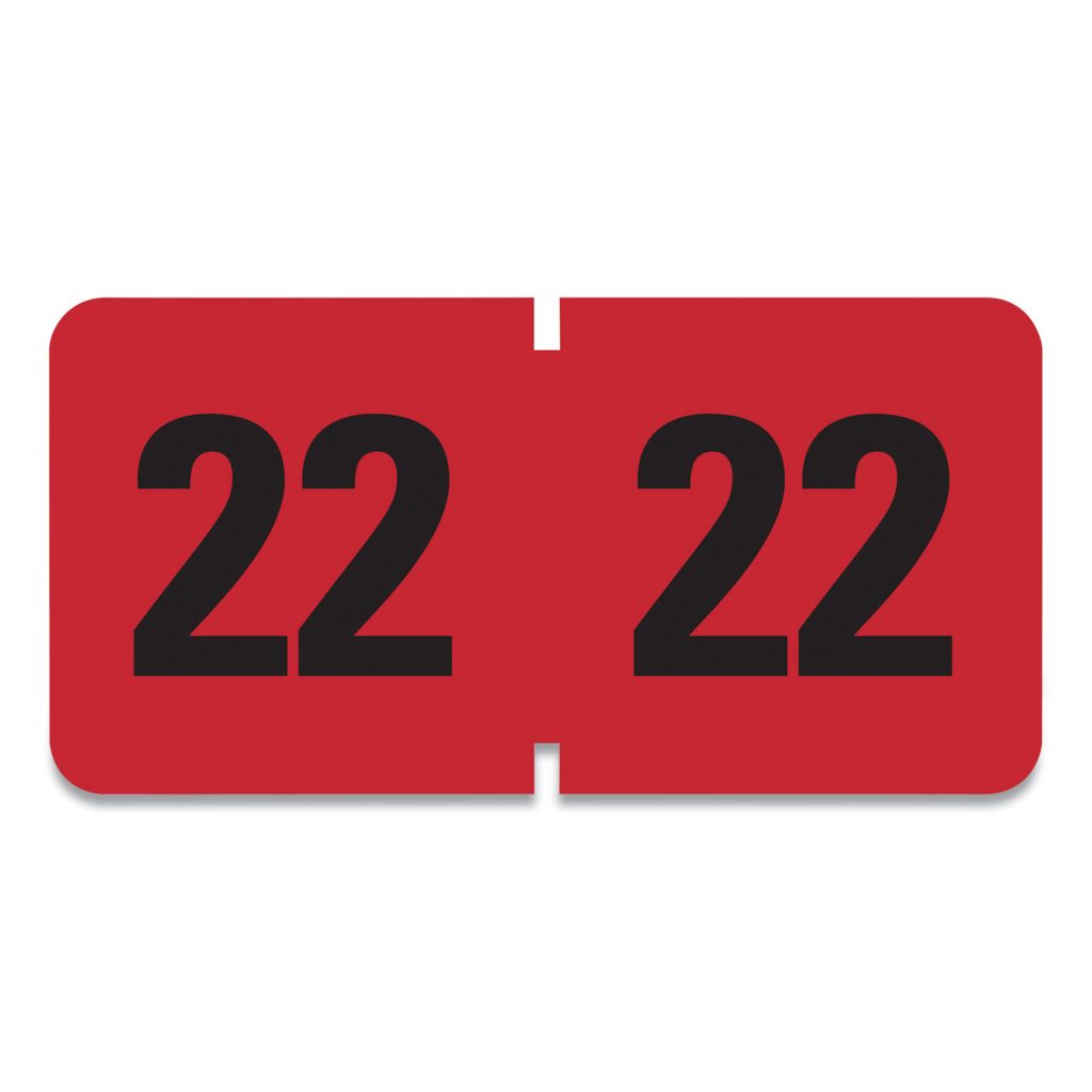 Indicate when a file was created or signal when a file should be destroyed or moved to inactive storage by coding end tab folders with these labels. Color coded labels makes it easy to locate all folders with the same date. Protected by clear laminate. Scored, wraparound color bar allows clear visibility from both sides of your folder. Works with most end-tab file folders (sold separately). Adhesive sticks securely. 2022. Shape: Rectangular; Label Size – text: 0.75 x 1.5; Label Color(s): Red; Color Family: Red.