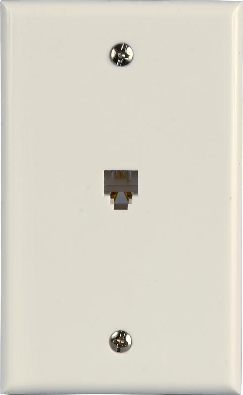 The flush mount telephone wallplate with white finish allows flush mounted connection of phone line through a wall.