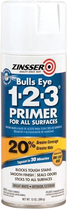 Zinsser Bulls-Eye 1-2-3 primer is a high-hiding, all purpose, primer-sealer and stain blocker that provides up to 20% more coverage than competitive products. It blocks and seals stains caused by water, nicotine, smoke, tannin, pencil, ink, grease and felt marker and seals smoke and pet odors. It is suitable for use on any interior or exterior wood, concrete, drywall or non-galvanized metal, including hard-to-paint surfaces such as railings, shutters and outdoor furniture. It is ideal for sealing spackle, drywall repairs and hiding dark colors. It has excellent adhesion to glossy paint, glass and ceramic tile.