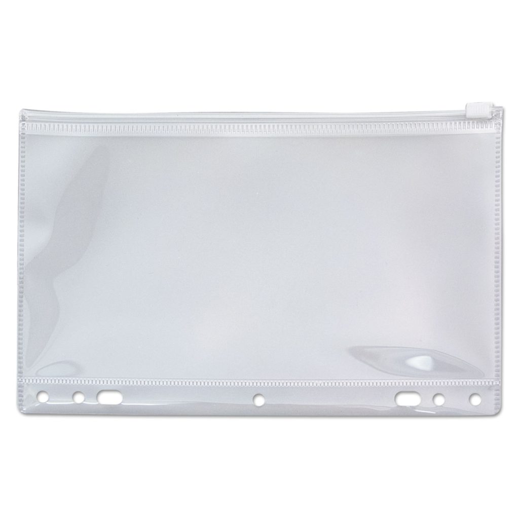 The binder pocket will safely secure your desk supplies! Keep writing instruments, paper clips and various loose items neatly contained and close by. Features heavy, clear matte polypropylene body with a plastic snag-proof zipper pull. Hole-punches allow use in various size binders. Heat sealed edges ensure contents remain secure.